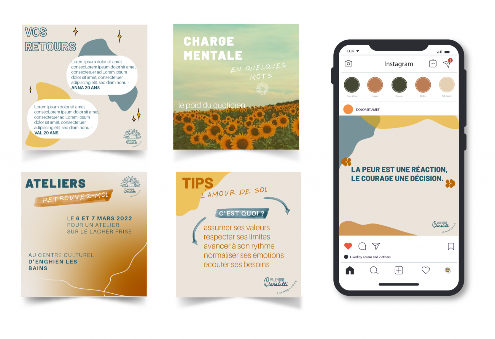 Identité visuelle, déclinaison digitale, print, illustrations et site internet pour le lancement d’une activité indépendante de sophrologue.
